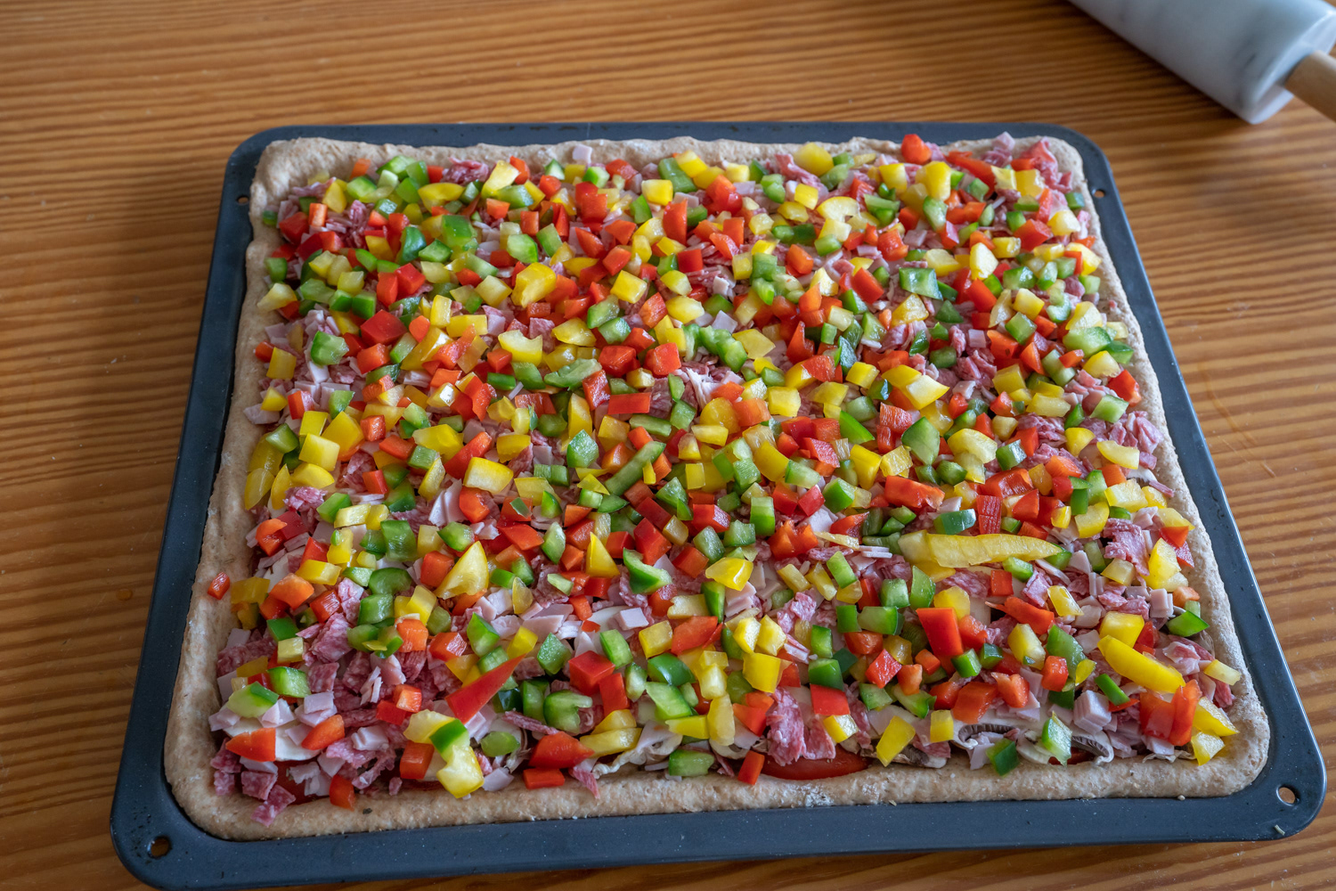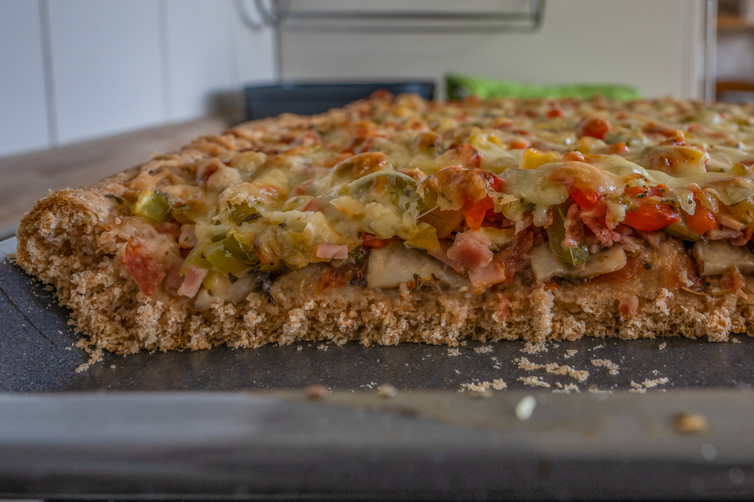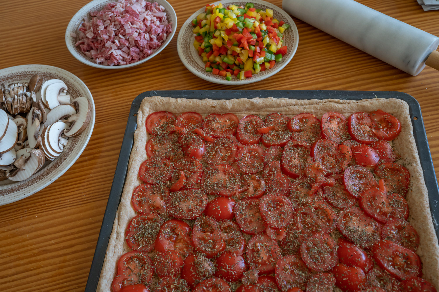 Einfach eine sau gute Pizza. Probiert selbst 500g. Vollkornmehl, 1 halber Würfel Hefe, 1 Essl. Salz, 3 Esslöffel Olivenöl, 300ml Wasser, 500g Tomaten, 500g Schinken und Salami, 500g Paprika, 400g Champignon, Pizzagewürz und etwas Salz